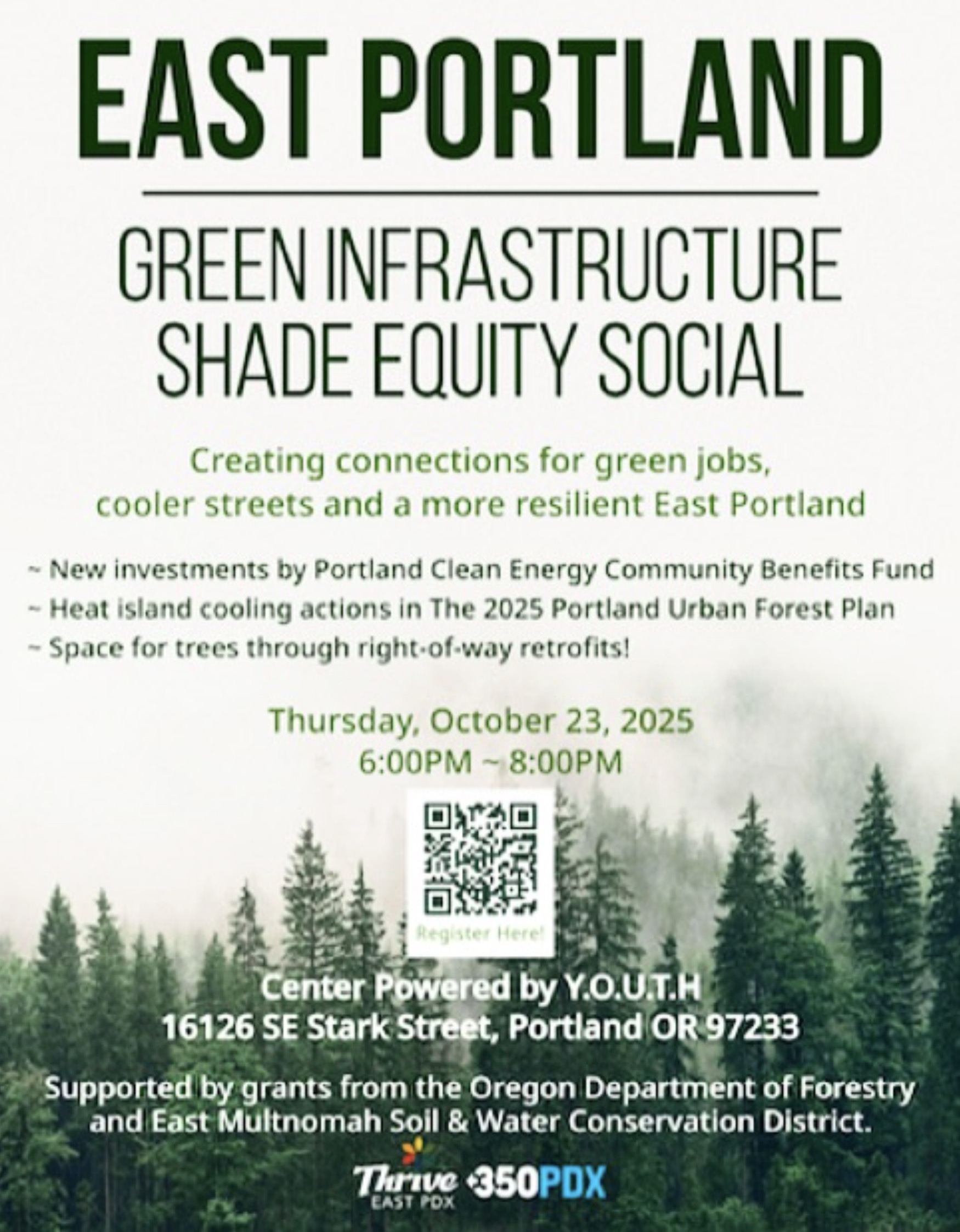 “Join Thrive East PDX and 350PDX for an evening of creating connections and building pathways toward green jobs, cooler streets and a more resilient East Portland. This will be the first of two socials to encourage youth to get involved in green infrastructure. The next will be in the Spring of 2026. Kids activity and refreshments will be provided. “
