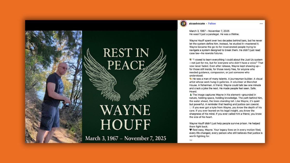 The nonprofit Adults in Custody posted a memorial to Houff on Instagram. “He never let the system define him,” it says. “Instead, he studied it—mastered it. Wayne became the go-to for incarcerated people trying to navigate a system designed to break them. He didn’t just read case law—he rewrote futures.”
